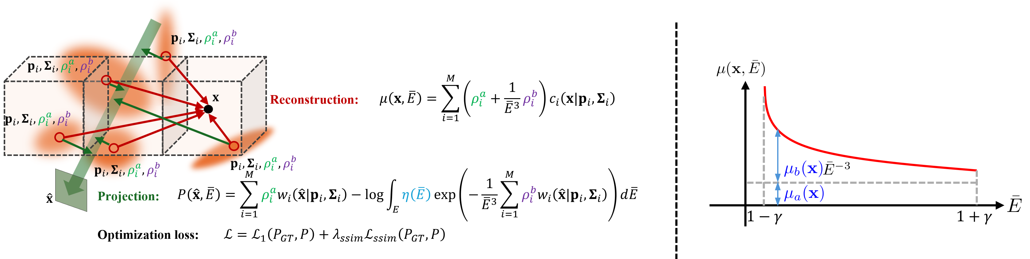 Our method jointly models projection and reconstruction by optimizing per-Gaussian material parameters together with the global X-ray response. A physics-based attenuation model decomposes material behavior into Compton and photoelectric components, enabling accurate polychromatic forward projection and effective metal artifact reduction without metal masks.